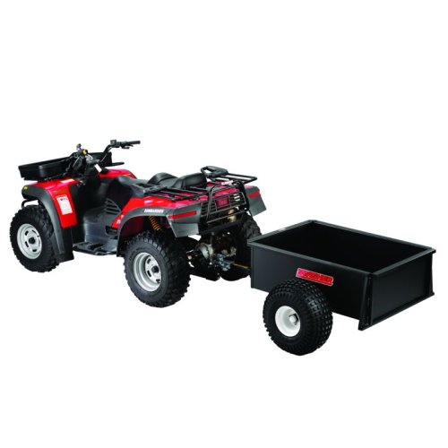 Swisher 15 cu. ft. ATV Dump Cart Trailer Transport and unload with ease... this Swisher ATV Dump Cart Trailer is great for hauling firewood, landscaping materials, fencing supplies or almost anything else you need to get from one place to another: Ruggedly designed to go where your ATV can go; 15 cu. ft. heaped capacity; 3'6" x 2'7" x 1'6" box, 4'2" wide with tires; 700-lb. load capacity; Wide wheel base and low load height, provides stability; All welded construction made from heavy duty 14-gauge steel provides extra strength; Large ATV tires allow access through rough terrain; High speed tapered bearings provide long life; Quickly dump by removing quick release pin and lifting removable tailgate; 1-7/8" ball coupler supplied; Gate is easily removed by lifting out of track; Quickly attaches to ATV with supplied ball hitch coupler; Extra long tow bar allows for sharper turning radius, while offering more space behind ATV rack for optional rack accessories; Powder coat paint provides durable, ultra tough finish; Some assembly required. Order yours today! Swisher ATV Dump Cart Trailer